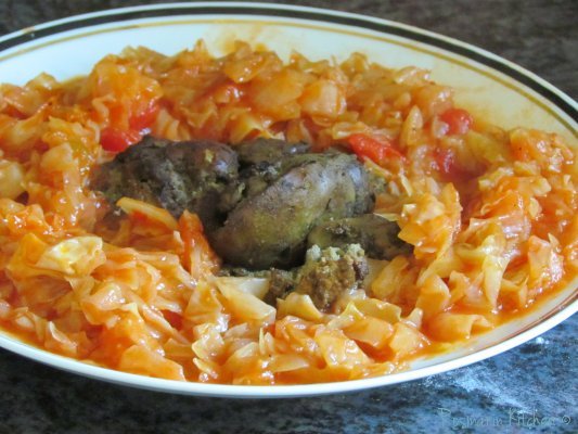 - להוסיף מלח, פלפל, פפריקה, עגבניות מקולפות קצוצות, מיץ לימון, רוטב צ'ילה ולבשל על אש נמוכה לפחות כ40 דקות עד שהכרוב רך וסופג את טעמי התבשיל.